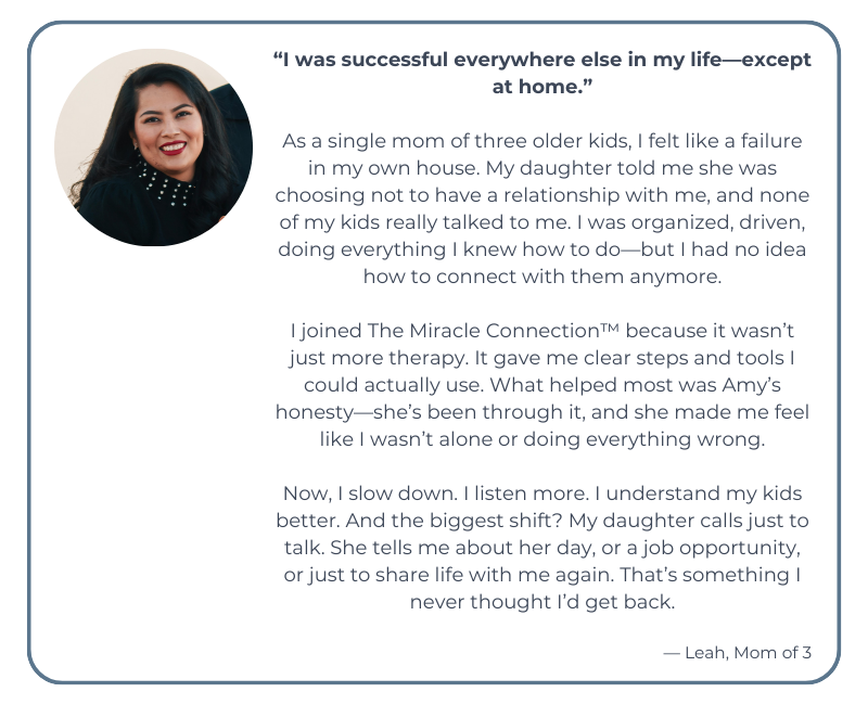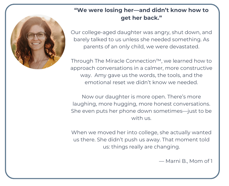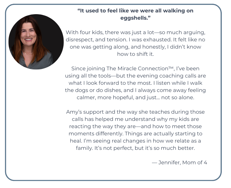 That’s what becomes possible inside The Miracle Connection™—when you shift the energy between you, the relationship begins to heal. They feel better. And home starts to feel light again.